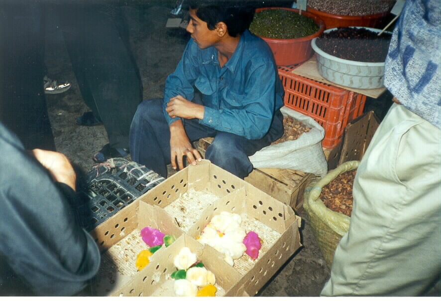 chicks in the market Young chickens, dyed fluorescent colours, sold as